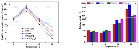 Influence of temperature of incubation on the activity of free laccase and PA6@L conjugates: (a) Specific laccase activity and (b) relative laccase activity.