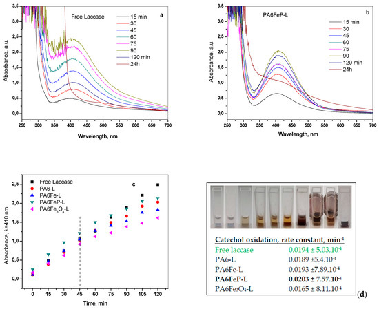 Figure 10 displays the combined results of these kinetic studies. The evolution of the quinone absorption peak with time in the presence of native laccase is shown in Figure 10a, and in the process catalyzed by the PA6FeP-L conjugate—in Figure 10b, as a representative example for all PA6@L samples. Figure 10c presents the respective time dependence curves for all PA6@L conjugates and for the native laccase, wherein is the UV-VIS absorption at λ = 410 nm. Figure 10d visualizes the deepening of color in the cuvette with the catechol solution due to the action of the magnetic sensitive PA6@L laccase conjugate, as well as the separation of the latter from the reaction medium by a constant magnet. The rate constants of the enzymatic oxidation caused by all samples studied are also represented in Figure 10d. They were calculated as the slope of the linear segments of the time dependencies in Figure 10c (0–45 min interval). The spectral study on the laccase-catalyzed catechol oxidation reveals high rate constants for the PA6-L, PA6Fe-L and PA6FeP-L conjugates, most of them being very close to or even slightly higher than that of the free laccase. Only the rate constant of the PA6Fe3O4-L sample is statistically lower. All these results are in good agreement with the previous data of this study on the laccase content, activity, and densification on the respective PA6 supports.
