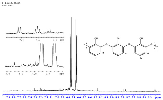 Expanded 1H NMR spectrum of the solid residue after the first oxidation cycle of catechol. Polymerization mediated by PA6-L. Solvent CH3OD, room temperature, 600 MHz.