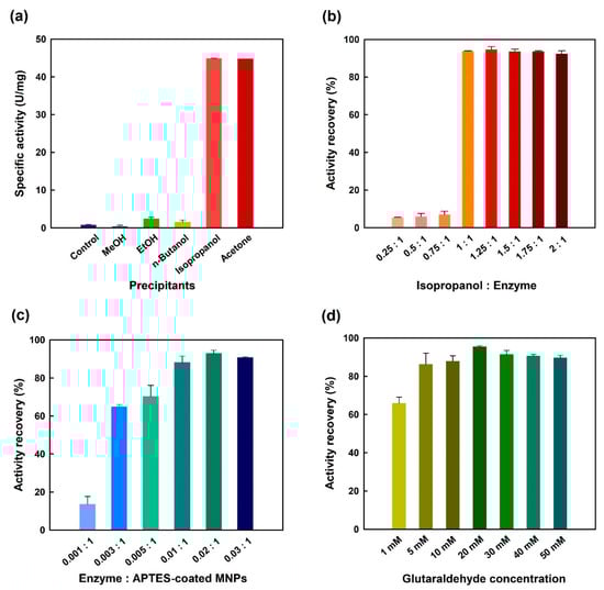 Effects of different precipitants (a), isopropanol/enzyme ratio (b), enzyme/APTES-coated MNPs ratio (c) and glutaraldehyde concentration (d) on the immobilization of N450D. Control group in panel (a) represents enzyme sample without the addition of precipitating agent.