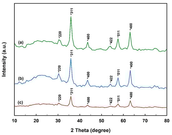 The crystal structures of bare and APTES-coated MNPs, and N450D-mCLEAs as well were individually obtained from X-ray diffraction (XRD) pattern recorded on a XRD-6000 powder diffractometer (Shimadzu Co., Kyoto, Japan) using a monochromatic X-ray beam with nickel-filtered Cu Kα radiation (λ = 1.54 Å). A continuous-scanning mode was used to collect the 2-theta values from 25 to 90°. Infrared spectra of bare and APTES-coated MNPs, and N450D-mCLEAs were recorded, respectively, by a Shimadzu IR Prestige-21/FTIR-8400S spectrophotometer (Shimadzu Co., Kyoto, Japan) over the wavelength range of 4000 to 400 cm−1 using the KBr pellet technique. The surface morphology and size of bare and APTES-coated MNPs, and N450D-mCLEAs were determined by FESEM (JeoL JSM-7800F Prime, Hitachi High-Technologies, Tokyo, Japan). EDS attached to FESEM was used to analyze the elemental composition of the above-mentioned samples. The magnetic properties of bare and APTES-coated MNPs, and N450D-mCLEAs were determined under a varying magnetic field by a Superconducting Quantum Interference Device (SQUID) Vibrating Sample Magnetometer using a physical property measurement system 9 T DynaCool (Quantum Design North America, San Diego, CA, USA).