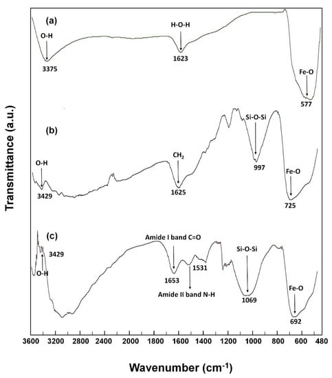 The crystallinity and crystallite size of MNPs are important properties that interact strongly with the crystallization process itself as well as having a great influence on the end-use applications [51,52]. In this regard, XRD was employed to study the crystalline structure of MNPs before and after the immobilization process of N450D. Powder XRD patterns of as-synthesized samples showed the position and relative intensities of all diffraction peaks matching well with the reference magnetite Fe3O4 pattern (JCPDS card 19-0629) (Figure 2). The results suggest that MNPs with cubic inverse spinel structure were successfully synthesized. As can be noted in XRD diffractograms, the coating and cross-linking steps did not change the core-shell structure of MNPs. However, the characteristic diffraction peaks of MNPs were attenuated in the pattern of N450D-mCLEAs. This observation can be explained by shielding effect of enzyme immobilization. Confirmation analyses of the APTES coating and enzyme immobilization were performed using FTIR analysis. As shown in Figure 3a, the FTIR spectrum of MNPs demonstrated a strong absorption characteristic peak at 577 cm−1 corresponding to the intrinsic stretching vibrations of metal-oxygen (Fe-O). The spectrum of APTES-coated MNPs showed a characteristic peak at 997 cm−1 due to the stretching vibrations of Si-O and a prominent peak at 1625 cm−1 corresponding to the bending vibrations of C-H (CH2) (Figure 3b) [53]. Furthermore, the FTIR spectrum of N450D-mCLEAs exhibited characteristic peaks at 1653 and 1531 cm−1 corresponding to the stretching vibrations of C=O (amide I band) and N-H (amide II band), respectively, and an intense peak at 3429 cm−1 corresponding to the stretching vibrations of O-H (-COOH) (Figure 3c). All these observations suggest the successful immobilization of N450D on the APTES-coated MNPs.