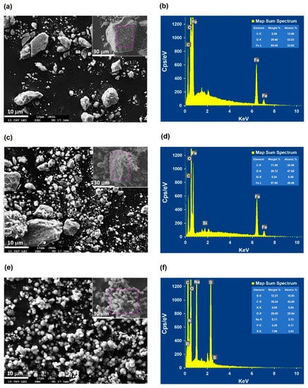 FESEM images and EDS spectra of bare (a,b) and APTES-coated (c,d) MNPs, and N450D-mCLEAs (e,f).