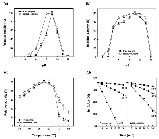 As compared with free enzyme, N450D-mCLEAs were active in the range of 8–9 and had an optimum pH of 9.0 (Figure 6a). The significant shift in the pH range of N450D-mCLEAs can result from the changes in the ionization states of acidic and basic residues around the active site during the cross-linking. This observation is in line with an earlier report on the pH shift for acrylamidase-CLEAs [27]. Moreover, N450D-mCLEAs displayed relatively greater stability than free enzyme at each pH (Figure 6b). As in the case of acrylamidase-CLEAs [27], such a result can be attributed to the increased structural rigidity of N450D upon immobilization.