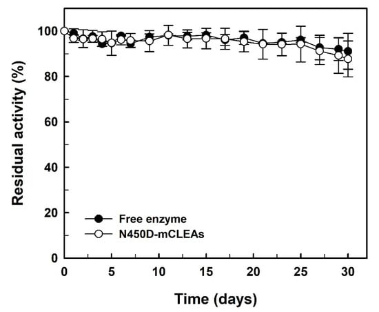 Several previous studies have already noted that free enzymes can generally lose their activities fairly quickly during the storage period [54,55,56,57]. Considering that immobilization is one of the important ways for enzymes to become stable [58], the storage stability of free enzyme and N450D-mCLEAs was evaluated and the experimental results are shown in Figure 7. In contrary to the above-mentioned reports, both N450D and N450D-mCLEAs retained greater than 87% of their initial GGT activity after one month of storage at 4 °C. The storage stability data are consistent with those of the immobilization of BlGGT in surface-functionalized hyperbranched poly(amido acids) magnetic nanocarriers [59] and graphene oxide nanosheets [60]. It is also noteworthy to mention that no GGT activity was found in the clarified solution of N450D-mCLEAs. This observation clearly indicates that N450D is stably present in the matrix of mCLEAs.