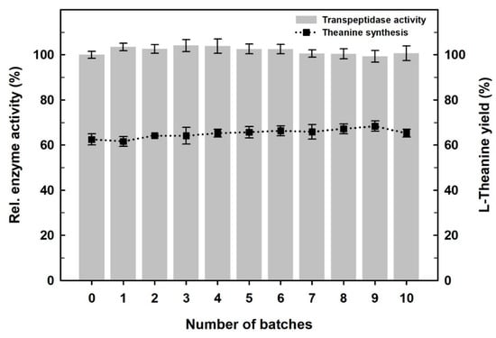 The bioactive compounds produced by natural species are of great importance for modern therapeutics [61]. l-Theanine is such a bioactive nonproteinic amino acid presented in a variety of plants and fungi, especially in tea tree [62,63]. It has a high impact on preventing lifestyle-related diseases, such as cardiovascular disorders, hypertension, diabetes, liver injury and tumor suppression [63,64]. This bioactive amide can also help to maintain healthy sleep, improve mental clarity, and nullify the harmful effects of neurotoxins [64,65]. Due to the important contribution of l-theanine to a wide range of significant health benefits, there is an increasing demand for its use in the fields of dietary supplements, functional food ingredients, and nutraceuticals [64,66,67]. Over the past few years, extensive efforts have been devoted to establishing a biocatalytic process for the facile and efficient synthesis of l-theanine using bacterial GGT enzymes [68]. In our earlier study, the biocatalytic synthesis of l-theanine from inexpensive substrates, l-glutamine and ethylamine, by N450D was achieved at molar scale with a conversion rate of approximately 94% [44]. Considering that l-theanine can be efficiently synthesized by N450D-mediated reaction, N450D-mCLEAs were recycled ten consecutive times using l-glutamine as the donor substrate and ethylamine as the acceptor substrate. As shown in Figure 8, N450D-mCLEAs earned a 63.2% conversion rate for the first run of biocatalytic synthesis and the conversion efficiency did not decrease significantly in the successive cycles. The amazing reusability of N450D-mCLEAs absolutely renders the immobilized enzyme with prosperous prospects in practical applications.