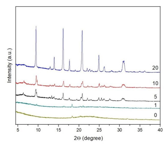 pXRD of as-made SSZ-13 products obtained from mixtures prepared with precipitated silica with an application of milling for various times: 0—only preliminary manual grinding, 1, 5, 10, 20 min of milling. (Reprinted with permission from [46]. Copyright: 2019, John Wiley and sons).