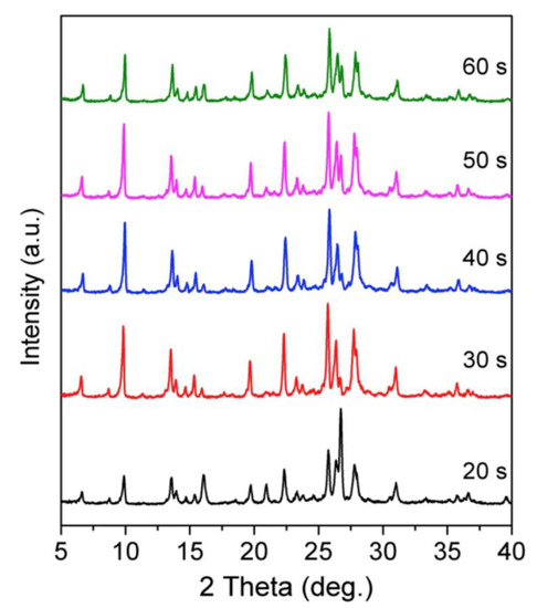 A similar approach to the optimization of grinding time was applied by Gao [42] for the MOR synthesis from a mixture of hydrated sodium silicate as the Si source. Quite short grinding times ranging from 30 to 60 s were sufficient in that system (Figure 3). Most probably this is connected with the high reactivity of the silica source.