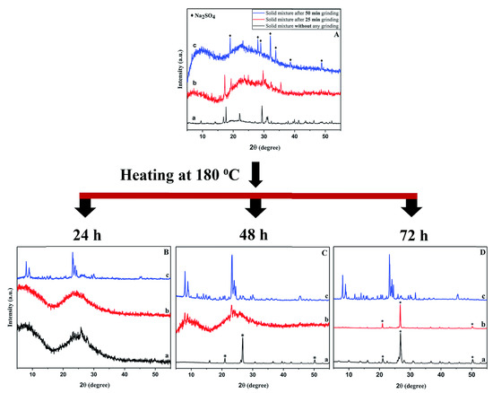 (A) XRD of solid precursor mixture reagent mixture of Na2SiO3, Al2(SO4)3, and SiO2 (equivalent Na2O:Al2O3:SiO2 ratio of 5:1:30) ground for different periods of time (a—no grinding, b—25 min, and c—50 min). Asterisks in A indicate Na2SO4. The XRD of washed products after heating at 180 °C for periods of: 24 h (B), 48 h (C), and 72 h (D). Asterisks in (C) and (D) indicate quartz peaks. (Reprinted from [44]. Published by The Royal Society of Chemistry).