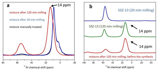 On the other hand, unnecessary prolongation of the milling pretreatment leads to increased consumption of energy and exploitation of milling parts. It can trigger the side reactions that occur during milling, even before the thermal treatment. To demonstrate this, the mixture used for the preparation of SSZ-13 zeolite in [46] was subjected to 120 min milling (six times longer than the optimized time), followed by similar thermal treatment as the successful synthesis performed earlier. Although the crystallization of the SSZ-13 structure partially occurred, the comparison of 27Al MAS NMR spectra of the milled mixture and the product (unpublished results obtained during work by the Pashkova group, presented in Figure 5) showed the presence of the peak associated with Al octahedral species at 14 ppm, formed during the milling process, which did not disappear even after the thermal crystallization. These octahedral species contributed to the lower quality of the SSZ-13 product (in low-defect zeolite phase of high crystallinity, only the framework tetrahedral Al should be present, as seen in the spectrum of SSZ-13 product after 20 min, see Figure 5b).