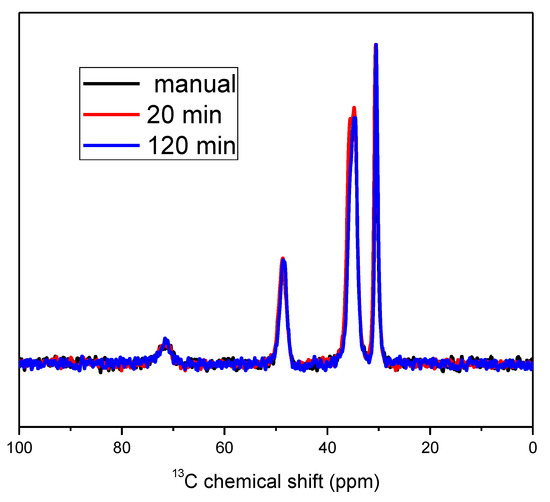 Due to the fact that intense milling could deliver significantly higher energy to the reagents than manual treatment, the applicability of organic compounds should be evaluated before the milling with consideration for their possible decomposition. For example, when using tetraethylammonium bromide (TEABr) as an OSDA in the mixtures with sodium metasilicate or with precipitated silica at 400 rpm and 20 min milling time (unpublished results, obtained during work by Pashkova et al. on the production of zeolite Beta), the release of Br2 was observed, indicated by the yellowish-brown color of the mixture and specific smell. Due to this, in further studies, the bromide forms of OSDA were not applied and the hydroxide forms in solution were used instead. On the other hand, Ref. [45] reported successful preparation of ZSM-5 with the application of tetrapropylammonium bromide (TPABr), milled in a synthesis mixture for 5 min at 1200 rpm in a ball mill without observing Br2 release. The presented data show that the halide forms of OSDAs might be applicable at milder milling conditions or at shorter milling times, whereas if the mixture requires more intense treatment, these forms of OSDA might decompose and should be avoided.