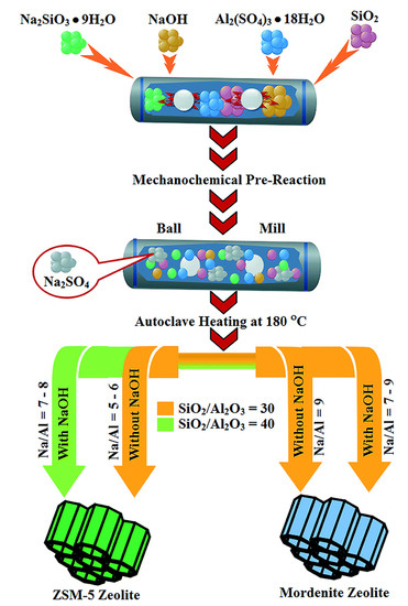 - Nada, M.H.; Gillan, E.G.; Larsen, S.C. Mechanochemical reaction pathways in solvent-free synthesis of ZSM-5. Microporous Mesoporous Mater. 2019, 276, 23–28. [Google Scholar] [CrossRef]
