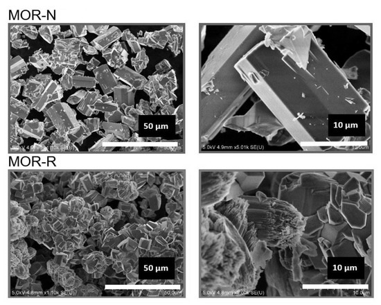 For example, in studies by Kornas et al. [43] the mordenite prepared by the solvent-free route was compared with reference material prepared from the same reagents and with the same synthesis time and temperature, but in solution (Figure 10). The solvent-free zeolite (MOR-N) showed bigger crystals with sharp edges compared to smaller crystals of different morphologies obtained by the traditional route (MOR-R).