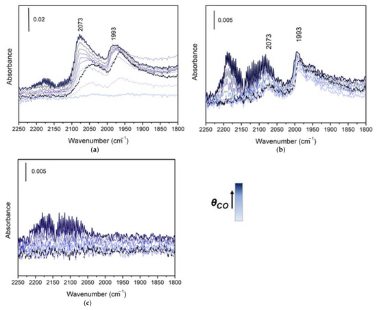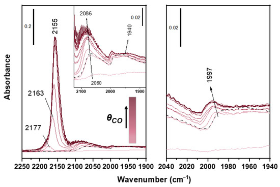 Washcoat powders were compressed in self-supporting discs (~20 mg cm−2) and placed in IR cells suitable for high-temperature treatments and FT-IR analysis at room and liquid-nitrogen temperature (RT and LNT, respectively). Measurements performed at LNT allow to characterize the metal phase and the oxidic support as well. Before the IR measurements, the samples were pretreated, following two different protocols. The first one was a treatment in vacuum at 400 °C for 30 min. The second one was an activation protocol through oxidation and subsequent reduction of the material. The oxidation step was performed in a static system using dry O2 on the sample at 400 °C. Oxygen was used twice, at about 40 mbar for 15 min per each step: the first treatment was useful to remove reduced species, possibly adsorbed on the surface; the second treatment was performed to ensure the oxidation. The reduction step was performed in the same way as the previous one, but the treatment was carried out in H2. Hydrogen was used twice at 40 mbar for 15 min per each step. The double treatment was intended to ensure the reduction. Finally, the sample was outgassed and cooled to RT in vacuum. Absorption/transmission IR spectra were run on a Perkin-Elmer FTIR System 2000 spectrophotometer (Perkin-Elmer, Waltham, MA, USA) equipped with a Hg-Cd-Te cryo-detector, working in the range of wavenumbers 7200–580 cm−1 at a resolution of 2 cm−1, with 60 scans. IR absorbance spectra were acquired at RT and LNT on the pretreated samples at increasing CO pressure up to 20 mbar.