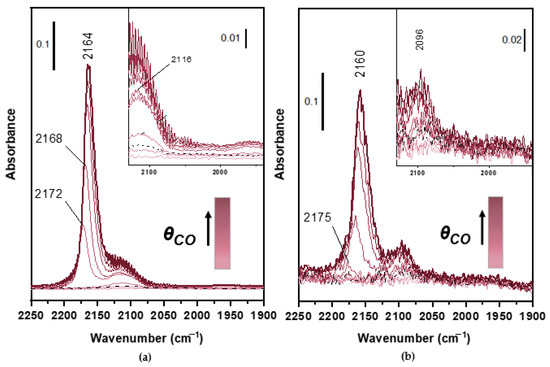 The peaks associated to adsorption on the support material display a similar behavior: the intensity decreases upon ageing, due to the sintering of Ce-Zr oxides. This phenomenon causes not only a loss in intensity of the band but also a decrease in the chemical effect that causes a shift to higher frequencies at maximum coverage with respect to the fresh case. In particular, in the 60 k sample (Figure 3a) a peak assigned to mono carbonyls on reduced Ce3+ species appears at 2116 cm−1 (see Figure 3 insets). The assignment of this band to the carbonyls on the support cation is corroborated by the low stability of the species, which are removed by outgassing (dashed line in Figure 3a). The appearance of this peak can be linked to the effects of ageing: the high temperature sintering of these components hindered the Ce4+ to Ce3+ redox reaction [34]. In addition, there may be a contribution of chemical ageing, with Ce reacting with the phosphate compound present in the engine out gas, coming from the combustion of engine oil additives, forming the very stable CePO4 phase [16,17,18,19,20,21,22,23,24,25,26,27,28,29,30,31,32,33,34,35]. These effects lead to immobilization of Ce, hindering its participation to redox reactions necessary for oxygen storage. In this case, the peak can be due to both this effect and is consistent with the reduction of the OSC observed during the performance tests (see below). The laboratory-aged (Figure 3b) show a less intense peak associated to Ce3+, probably because in this case there is only the support sintering contribution. This sample has not been in contact with chemical species deriving from the combustion, so the chemical ageing effects in this case are not expected. As for the laboratory-aged sample, the contribution of Pd0-CO at 2096 cm−1 is quite evident. Moreover, it is worth to note that in the 60,000 km sample Pd0-CO might be associated to the shoulder of the peak at 2116 cm−1, the Ce3+-CO band, which is absent for the laboratory aged one.