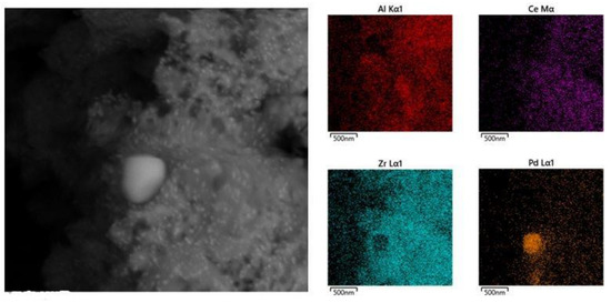 In order to observe noble metals particles and follow their evolution during the ageing, all the samples were observed using a field emission scanning electron microscope: a FE-SEM TESCAN S9000G (TESCAN ORSAY HOLDING, Brno, Czechia) equipped with a Schottky type FEG source. The detectors were an In-Beam Secondary Electron (SE) detector with a resolution of 0.7 nm at 15 keV, and a back scattered electron detector (BSD). Elemental analysis was measured with an EDX detector Ultima Max OXFORD (Oxford Instruments, Abingdon, UK) with AZTEC software.
