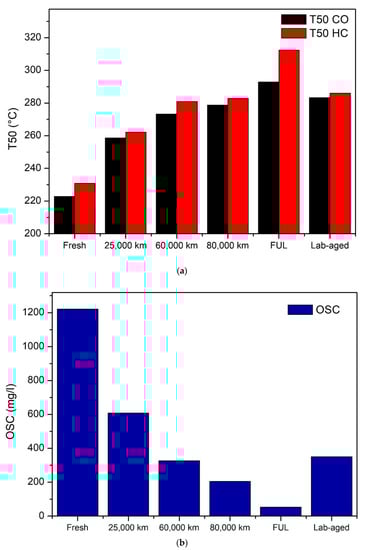 The oxygen storage capacity decreases significantly upon ageing (Figure 7b). The OSC for the 25,000 km sample is half of that of the fresh one. Similarly, we observe almost a halving of the OSC between 25,000 km and 60,000 km. This phenomenon is linked to the redox properties of the oxygen storage components that were found to drastically change with increasing ageing, due to thermal and chemical ageing, as already highlighted by LNT FT-IR measurements. In terms of performances, the Lab-aged samples are quite similar to the 60,000 km sample, with almost equal light-off temperatures. OSC displays some differences between these samples, with lower values for vehicle-aged samples, probably due to the chemical ageing contribution. In the FUL sample, the oxygen storage capacity is completely compromised.