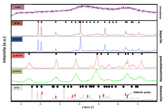 Their patterns (Figure 2) are characteristic for gamma (γ) alumina transition form (PDF 00-050-0741). Sample “a-Fe-500” still displayed an XRD amorphous phase. This could be ascribed to the nature of the amorphous hydroxide transformation, where higher temperatures are often needed to achieve the same transformation stage in comparison to ordered hydroxide structures as starting materials for dehydration procedure [20,24]. It can be presumed that in this case thermal treatment at 500 °C does not suffice to order the structure of alumina into gamma form and that this would be achieved at even higher temperatures. Dawsonite-based iron-alumina sample “d-500” consists of gamma (γ) alumina with additional peaks that were ascribed to dawsonite and sodium carbonate. It seems that the temperature transformation from dawsonite to alumina at 500°C was not sufficient to transform all of dawsonite to alumina phase. Sodium carbonate in this case is a side product of calcination of the NaAlCO3[OH]w form. To remove it, an additional washing step was applied at mild conditions to prevent any leaching of iron from the sample and to avoid any rehydration of the formed alumina and possibly formation of an unwanted phase [33]. The pattern suggests that not all of sodium carbonate was removed completely and some impurities remained. Based on the XRD patterns, calcination does not cause any differences in the presence of Fe species as they remain undetected by XRD.