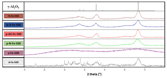 As described in the preparation procedure, all samples were synthesized in the presence of iron species. XRD pattern of iron-containing alumina precursor “a-Fe” shows a completely amorphous phase. When exposed to elevated temperatures, in this case 500 °C (Figure 2), the hydroxide starts to dehydrate and transform into a transition phase alumina [20]. That was also the case of calcined samples “N-Fe-500”, “b-O-Fe-500”, “p-AS-Fe-500” and “p-N-Fe-500”. Patterns displayed in Figure 1 and Figure 2 show no presence of iron oxides, Fe-Al spinel phases or any other plausible iron species, which could indicate their absence or that their size and quantity are below detection limits.