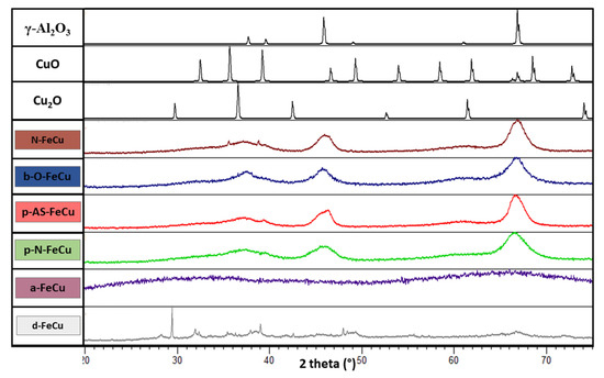 XRD patterns of calcined iron-alumina precursors impregnated with copper and reference patterns of γ-Al2O3 (PDF 00-050-0741), CuO (PDF 00-045-0937) and Cu2O (PDF 00-002-1067).