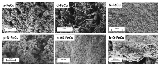 SEM images of the bimetal samples “a-FeCu”, “d-FeCu”, “N-FeCu”, “p-N-FeCu”,” p-AS-FeCu” and “b-O-FeCu”, exhibiting different morphologies of the prepared samples, which derive from different support structures and preparation procedures.