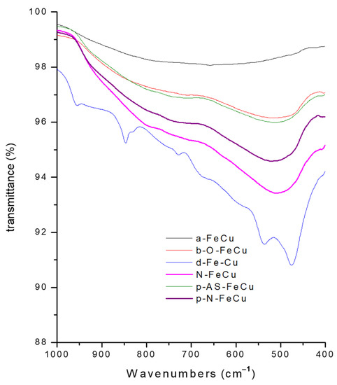 UV-Vis spectra of “N-Fe”, “N-FeCu”, “p-AS-FeCu”, “p-N-FeCu”, “a-FeCu”, “d-FeCu” and “b-O-FeCu” samples are shown in Figure 6. The analysis of spectra belonging to “N-FeCu”, “p-AS-FeCu”, “p-N-FeCu”, “a-FeCu”, “b-O-FeCu” and “d-FeCu” samples reveals Fe3+/Cu2+→O charge-transfer (CT) bands between 200 and 300 nm, which are usually assigned to isolated Fe3+ or Cu2+ ions [10,36,37,38,39]. Bands between 300 and 400 nm seen in all samples can be assigned to octahedral Fe3+ and Cu2+ in small oligomeric FexOy [10,36] and CuOx clusters [37,38], respectively. The shoulder at around 470 nm in the spectra of “N-Fe”, “p-AS-Fe”, “a-Fe” and “d-FeCu” samples is due to larger Fe2O3 nanoparticles [38,39], while the intensity of this band in the sample “p-N-Fe” is rather low, indicating the influence (as a consequence) of a different precursor preparation. Furthermore, the band between 600 and 850 nm corresponds to the d–d transition of Cu2+ ions in an octahedral environment, which can be attributed to CuO nanoparticles [38,40], is found in all Cu containing samples besides in the sample “d-FeCu”. Furthermore, the shoulder at 580 nm, which is typical for copper metal clusters [38,41,42], can be found only in the spectrum of sample “d-FeCu”.