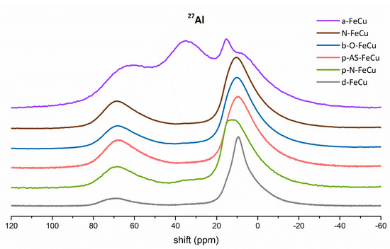 27Al MAS NMR spectra of “N-FeCu”, “p-AS-FeCu”, and “b-O-FeCu” samples are typical for the γ-Al2O3 phase (Figure 8). They all exhibit a signal of AlO4 groups resonating at about 68 ppm and a signal of AlO6 groups resonating at about 10 ppm, with relative abundancies of 0.30 and 0.70, respectively. As in the case of Samain et al. [48], they contain no or negligible amount of five-coordinated Al species. The spectrum of “p-N-FeCu” is slightly different from the previous three spectra; it does exhibit a weak contribution of AlO5 groups and a slightly different signal of AlO6 groups (see Supplementary Materials, Figure S4). The latter signal is probably a sum of two severely overlapped contributions, major one being typical for γ-Al2O3 and minor one belonging to alumina phase, characterized by the signal of AlO6 species that resonates at about 15 ppm (potential candidate are δ- and θ-alumina whose AlO4 signals are expected to overlap with the corresponding signal of γ-Al2O3 and which are expected products during the transformation of γ-alumina to α-alumina) [49]. However, the additional signals are very weak compared to the signals of γ-Al2O3, so it is expected that the properties of “p-N-FeCu” are not significantly different from the properties of “N-FeCu”, “p-AS-FeCu”, and “b-O-FeCu” samples. As opposed to that, the 27Al MAS NMR spectrum of “d-FeCu” exhibits markedly different relative intensities of the AlO4 and AlO6 signals. This is not surprising, considering that the XRD analysis already showed that this sample comprises γ-Al2O3 and non-negligible amount of dawsonite. The spectrum of “a-FeCu” is drastically different from 27Al MAS NMR spectra of all other samples. Its broad signals, including a very strong one belonging to five-coordinated Al species, confirm the amorphous nature of this sample.
