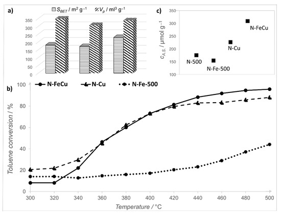 The structure stability of the catalyst was analyzed before the catalytic tests in a temperature-programed regime with an XRD in repeated heating and cooling cycles. The structure of the catalyst remained intact according to XRD (Supplementary Materials, Figure S6). Prior to the synthesis and testing of all the catalysts, sample “N-500” was synthesized also without iron and impregnated with copper (II) in order to determine the impact of copper presence on the catalytic oxidation of toluene as a model compound and the coexistence of Cu and Fe species on alumina support. Figure 13 presents the catalytic activity of samples “N-Fe-500”, “N-Cu” and “N-FeCu” with their textural properties: specific surface area SBET, pore volume Vp and acid sites concentration. All samples have similar pore volume and specific surface area (Table 1), the only difference being the sample “N-Fe-500”, which has slightly higher Vp and SBET due to the fact that it is not an impregnated sample where surface area and pore volume decrease occurs. The sample without copper species did not reach even 50% of conversion of toluene at the highest utilized reaction temperature. The other two samples, “N-Cu” and “N-FeCu”, performed better proving that copper is the active component for this reaction. The presence of iron in the sample and possible causing of a synergistic effect was visible above 420 °C, when the conversion of the Cu and Fe combined alumina catalyst exhibited up to 10% better conversion. At temperatures below 360 °C the presence of iron seemed to have a negative effect on the oxidation reaction of toluene as the activity of “N-Cu” catalyst was higher. Acid site concentration of the support has been improved significantly with copper addition, suggesting that the presence of copper species causes vacancies in the structure and therefore making new acid sites. Another interesting observation was found, namely iron influenced a decrease of the number of acid sites, suggesting that it could be incorporated into the alumina structure compensating the Lewis acidity of alumina, i.e., coordinately unsaturated Al3+ ions. Acid site concentration was increased by two fold in coexistence of copper and iron species, relative to that without Cu. When iron was not present in the sample, this increase was only 29%, relative to alumina support. This could suggest a beneficial interaction between iron and copper leading to more structure defects and causing surface acidity, which is one of the major properties of a catalytic materials for this type of a reaction [50].