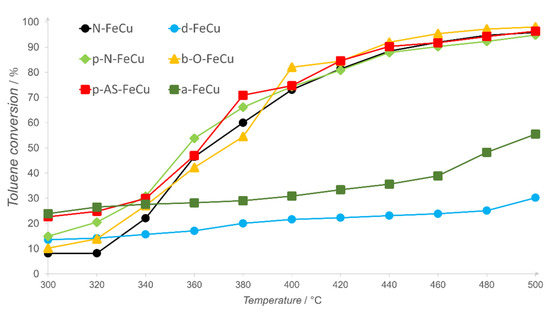 In all tests, only carbon dioxide and water were the products of toluene oxidation reaction. The studies were performed in a temperature-programed regime to determine the activity of the samples. Results show (Table 2 and Figure 14) that the samples “d-FeCu” and “a-FeCu” performed poorly in this reaction, probably because catalysis is a surface reaction and those two samples exhibited the lowest specific surface area of 26 and 45 m2/g, respectively. The sample “a-FeCu” had a quite promising starting conversion of toluene (24% at 300 °C), which could be explained with adsorption of toluene on the alumina surface, or the activity of the catalyst when almost all active sites are occupied and even higher temperatures do not contribute to significant conversion increase due to the mentioned low specific surface area. Besides low specific surface area, this sample is also amorphous. This was not the case for the sample “d-FeCu”, where only 30% conversion was reached at maximum temperature. Besides low specific surface area, this sample had also the most peculiar morphology consisting of approximately 10 µm long needles, which exhibited almost no interparticle porosity.