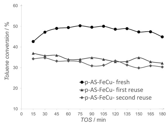 Catalyst “p-AS-FeCu” was chosen for stability and reusability determination (Figure 15). During the time on stream (TOS) the fresh catalyst remained stable, where the conversion of toluene was between 42% and 50%. After first use, the activity dropped and the toluene conversion was 37% at the start and 32% at the end of the test. The second use of the catalyst indicated a slight decrease in activity (34–30%) but in the similar conversion range as in the previous stage. This could suggest that the changes of the catalyst occur after first cycle and that the catalyst remains almost unchanged after additional cycles of use.