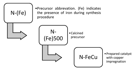 In all cases, iron was introduced during the synthesis of the alumina precursor. Further, all iron containing alumina precursors were dried at 105 °C for 24 h and then calcined at 500 °C for 2 h, with a heating ramp of 100 °C/h. Copper was loaded with an impregnation method on calcined iron-containing alumina precursors. The content of iron in iron-containing alumina precursors was adjusted to theoretical value of 0.8 wt% of Fe2O3. The desired copper oxide amount in the iron-containing alumina was 6 wt%. The samples were denoted according to their preparation procedure and structure. The nomenclature of the samples is shown in Figure 16. The descriptions of the synthesis procedures for precursors are explained in more detail in the Supplementary Materials, Figure S1.