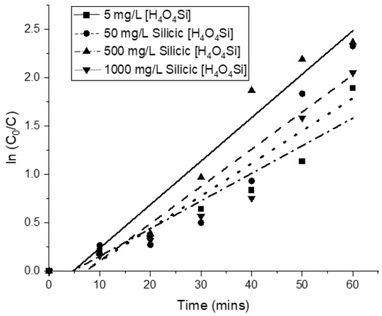 | Silicic Concentration of SGM (mg/L) | ln(C0/C) = kt + b | R2 | k (min−1) |