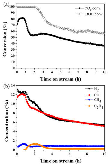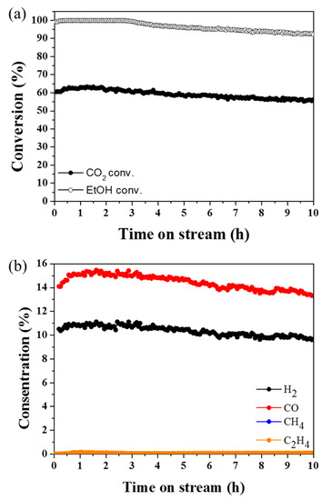 The catalyst durability is improved by additional carbon dioxide stream. There was no critical catalyst deactivation when the carbon dioxide/ethanol ratio was 3 (Figure 2a). The monitoring of the product gases showed that the additional carbon dioxide flow inhibited the formation of methane and ethylene (Figure 2b). These results further support that the rapid catalyst deactivation and coke formation at the low ethanol to carbon dioxide ratio originates from the formation of unwanted byproducts, such as methane and ethylene. Reduction of methane and ethylene concentrations signifies that the carbon dioxide might promote the direct reaction of ethanol and carbon dioxide by preventing ethanol dehydrogenation and dehydration. In addition, carbon dioxide can hinder coke formation via reverse Boudouard reaction [22,23].