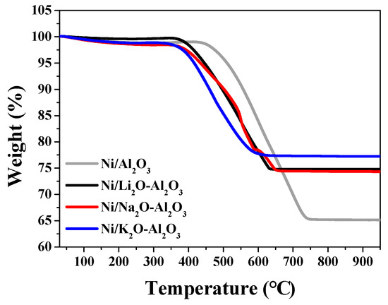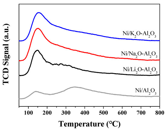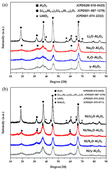 The crystal structures of the prepared catalysts were determined by X-ray diffraction (XRD) analyses (Figure 3). Sodium and potassium did not alter the original structure of γ-Al2O3. The XRD patterns of Na2O-Al2O3 and K2O-Al2O3 were almost identical to that of γ-Al2O3 [27]. However, lithium produced lithium-aluminum mixed oxide phase. Moreover, the sharp peaks of Li2O-Al2O3 signify that the crystallinity of the resulting material increased after lithium incorporation. The XRD patterns of Ni/Al2O3, Ni/K2O-Al2O3, and Ni/Na2O-Al2O3 showed no specific diffraction patterns related to nickel oxide. The absence of any diffractions corresponding to nickel oxide indicates that the impregnated nickel oxide is either well dispersed over the supports or forms a new crystal phase such as NiAl2O4 [28]. The XRD patterns of Ni/Li2O-Al2O3 are almost identical to the XRD patterns of Li2O-Al2O3. Nickel did not affect the crystal structure of Li2O-Al2O3 and likely forms small nickel oxide nanoparticles. The existence of both small nickel oxide particles and NiAl2O4 was confirmed by H2-temperature programmed reduction (H2-TPR) experiments (Figure S2). The reduction peak at lower temperatures (400 °C) corresponds to the reduction of the well dispersed nickel oxide to metallic nickel and large reduction peak at high temperature (850 °C) corresponds to the reduction of NiAl2O4 [29,30].