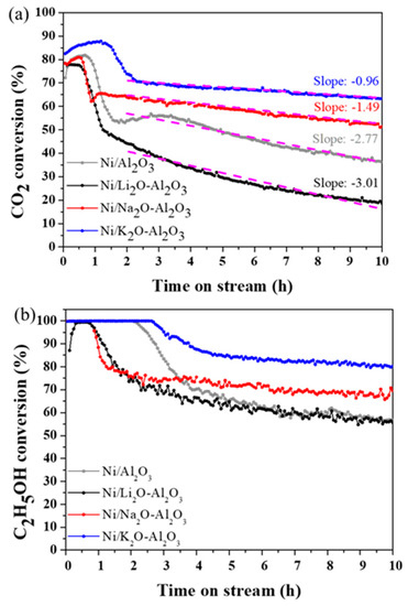To evaluate the influences of alkali metal additives, Ni/M2O-Al2O3 samples were tested for ethanol dry reforming. The reactions were performed at 700° stream conversion of ethanol and carbon dioxide. The highest carbon dioxide and ethanol conversion appeared with Ni/K2O-Al2O3. Here as well, similar to the case of Ni/Al2O3, decreases of carbon dioxide and ethanol conversion were observed after 1 h of reaction, which means the coke forms on the catalyst surface. However, the deactivation rates after initial sharp deactivation were varied between catalysts. The catalyst deactivation rates were evaluated by calculating slopes of the time on stream carbon dioxide conversion plots (Figure 4). The slopes were calculated using carbon dioxide conversion between 2 h and 10 h. The calculated slopes of time on stream plots are as follows; −0.96 for Ni/K2O- Al2O3 > −1.49 for Ni/Na2O-Al2O3 > −2.77 for Ni/Al2O3 > −3.01 for Ni/Li2O-Al2O3. Potassium and sodium containing catalysts exhibited enhanced catalyst stability than Ni/Al2O3. On the other hand, the addition of lithium deteriorated the catalytic ethanol dry reforming in terms of both activity and durability. The lowest surface area and pore volume, attributed to the formation of lithium-aluminum mixed oxide, might influence the performance of the nickel catalyst. The time on stream methane and ethylene distributions were examined (Figure S6). The concentrations of methane and ethylene were increased and disappeared at the beginning of the reaction, and the concentration difference between four catalysts was lower than 0.5%. These results indicate that the rate of methane and ethylene formation is similar, but coke formation is suppressed by alkali metal sites. Catalytic activity at lower temperatures than 700 °C (550 °C, 600 °C, and 650 °C) were also evaluated (Figure S7). Obviously, Ni/K2O-Al2O3 exhibited the better catalytic activity for both carbon dioxide and ethanol conversion than Ni/Al2O3, at all temperatures. In addition, alkali metal added nickel catalysts showed carbon dioxide conversion at 550 °C while the Ni/Al2O3 were still not activated.