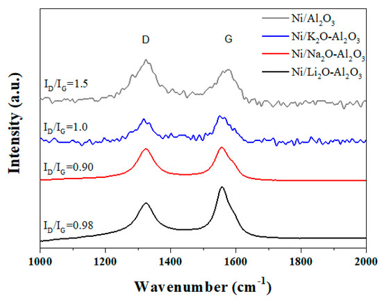 The structure of carbon was further studied by Raman spectroscopy. The D peak at around 1330 cm−1, which attributes to the disordered carbon structure, and the G peak at around 1550 cm−1, which attributes to the graphitic sp2 carbon structure were observed in the Raman spectra of the four catalysts (Figure 6) [32,33,34]. The ID/IG ratios of the catalysts were 1.5, 0.98, 0.90, and 1.0 for Ni/Al2O3, Ni/Li2O-Al2O3, Ni/Na2-Al2O3, and Ni/K2O-Al2O3, respectively. Since amorphous carbon constitutes more disordered structure than graphitic carbon, the ID/IG ratios in the Raman spectra of carbon materials increase as the amounts of amorphous carbon increases. Thus, the higher ID/IG ratio of Ni/Al2O3 signifies that the more amorphous carbon forms on Ni/Al2O3 than on the alkali metal promoted catalysts, and the alkali metal additives lead to the formation of different carbon structure.