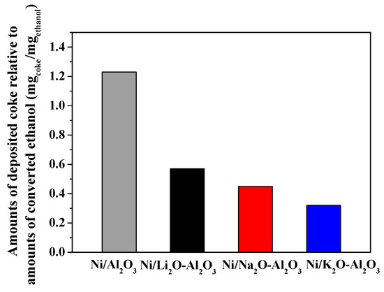 Because alkali metals are known to provide basic sites for catalysts, basic sites in each catalysts were examined by CO2-temperature programmed desorption (CO2-TPD) (Figure 9) to elucidate the influence of basicity on coke deposition. The two main carbon dioxide desorption peaks appeared at 130 °C and 250–330 °C, which correspond to the weak basic site and the strong basic site [31,35]. When alkali metals (Ni/M2O-Al2O3) were added, the low temperature desorption peak was dominant for the alkali metal doped catalysts, while the high temperature desorption peak was dominant for Ni/Al2O3. The order of basic site quantity is as follows: Ni/K2O-Al2O3 > Ni/Na2O-Al2O3 > Ni/Li2O-Al2O3 > Ni/Al2O3. This result shows that the alkali metals provide weak basic sites for nickel catalysts. In addition, the catalytic activity order is identical to the number of basic sites, except for Ni/Li2O-Al2O3 (Figure 4). Considering that the low catalytic activity of Ni/L2O-Al2O3 originated from the low surface area, we can infer that the increased catalytic activity of Ni/K2O-Al2O3 and Ni/Na2O-Al2O3 attributes to the basic sites. The correlation between number of basic sites and coke deposition is presented in Figure 10. The amounts of deposited coke decreased greatly on alkali metal promoted catalysts. This result shows that coke formation is inhibited by the weak basic sites that are offered by alkali metals.