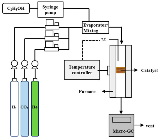 Figure 11 provides a schematic diagram of the ethanol dry reforming reactor system used in this study. A 1/2 inch quartz tube was used as a reactor and the temperature was controlled using a temperature controller inside the quartz tube. For ethanol dry reforming, 0.50 g of catalyst, shaped to have a diameter of 30–60 μm, was inserted and the temperature was increased to 750 °C under nitrogen flow. Then, the catalyst was reduced under flow of 5% H2/He for 1 h at the same temperature. Ethanol dry reforming was conducted at 700 °C with a GHSV of 40,000 h−1. The reaction gases were composed of 5 vol.% carbon dioxide and 5 vol.% ethanol balanced with helium for a carbon dioxide/ethanol ratio of 1, and 15 vol.% carbon dioxide and 5 vol.% of ethanol for carbon dioxide/ethanol ratio of 3. The product gases were analyzed by gas chromatography equipped with a thermal conductivity detector (Agilent Micro-GC 490, Molsieve 5A; H2, CO, CH4, Pora PLOT U; CO2, C2H4, CP-Wax 52 CB; C2H5OH) and infrared spectrometer (Nicolet iS10, Thermo Fisher).