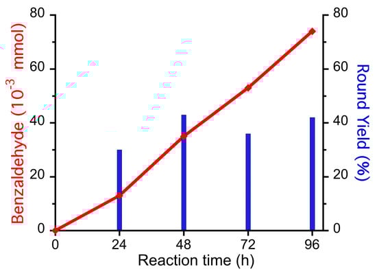 Importantly, recycle of the reaction mixture was successfully achieved at least for four runs, with preservation of yield and selectivity. Notably, reactions performed at 60 °C showed a continuous production of benzaldehyde, with a constant round yield. At the end of the fourth round, 74 × 10−3 mmol of benzaldehyde were obtained, with an overall yield of 37%. Such result opens the possibility to explore the application of flow-technique—i.e., continuous addition of reagents—thus allowing full conversion of toluene to benzaldehyde.