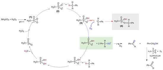 In fact, it is already well established that the dissolution of NH4VO3 in acid water (pH = 1) containing H2O2 leads to the formation of a vanadium (V) peroxido-complex (1), which is a very effective oxidant [,,]. In the first step of the cycle, the homolytic cleavage of the O–O bond possibly occurs, forming the radical V-complex (2), that can abstract a H• from toluene in solution, thus forming vanadium complex (3) and benzyl radical. The latter can react in two different pathways: with complex (3) itself, to form V-complex (4) in a non-productive way, or it can react with O2 in solution, to obtain the benzyl peroxy radical. The coupling of two benzyl peroxy radicals forms benzaldehyde, benzyl alcohol and O2 through a well-established mechanism []. The formed by-product, namely benzyl alcohol, is then immediately oxidized to benzaldehyde through a similar radical pathway, passing through H-abstraction from the OH group.