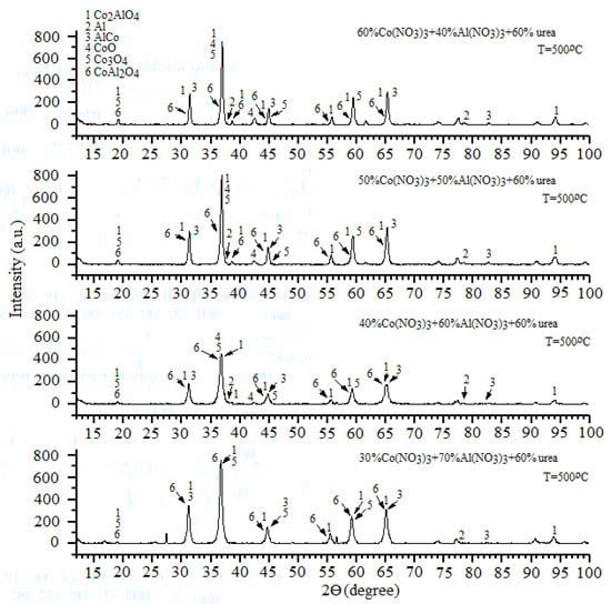 X-ray spectra for the Co(NO3)2 + Al(NO3)3 + urea + H2O system at a preheating temperature of the initial mixture of 500 °C.