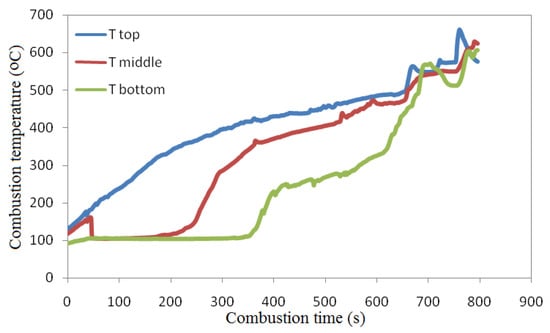 Temperature curves were measured during SCS in the muffle furnace heated to 500 °C. Three thermocouples were installed on top of the muffle furnace. All thermocouples were inside the glass. Thermocouples were in contact with the bottom, middle, and top layers of the solution. Two combustion modes—a volumetric explosion and a self-propagating mode—occurred during the synthesis of catalysts by solution combustion. The solution was heated, and water evaporated in the volumetric explosion mode. The gel formed after evaporation of water. The temperature in the muffle furnace gradually increased to critical. As soon as the temperature reached a critical value, the exothermic reaction took place throughout the entire volume of the catalyst.