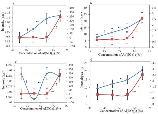 Change in the intensity of XRD peaks depending on the concentration of Al(ΝΟ3)3 in the initial mixture. (a) 1—CoAl2O4/Co3O4, 2—CoAl2O4/CoO; (b) 1—CoAl2O4/Al, 2—CoAl2O4/AlCo; (c) 1—Co2AlO4/Co3O4, 2—Co2AlO4/CoO; (d) 1—Co2AlO4/Al, 2—Co2AlO4/AlCo.