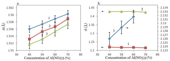 Effect of the concentration of Αl(ΝΟ3)3 in the initial mixture on the size of the crystal lattice for CoAl2O4, Co2AlO4, Co3O4, CoO, AlCo, Αl: (a) 1—CoAl2O4 (hkl = 511), 2—Co2AlO4 (hkl = 511), 3—Co3O4 (hkl = 511); (b) 1—Al (hkl = 311), 2—AlCo (hkl = 200), 3—CoO (hkl = 200).