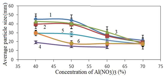Dependence of the crystallite size on the concentration of Al(NO3)3; 1—CoAl2O4 (511), 2—Co2AlO4 (511), 3—Co3O4 (511), 4—CoO (200), 5—AlCo (200), 6—Al (311).