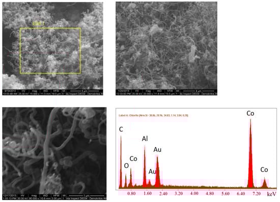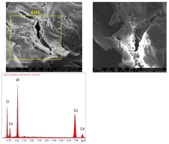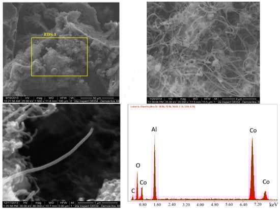 SEM images of the 30% Cο(ΝΟ3)2 + 70% Al(NO3)3 catalyst (synthesis temperature T = 500 °C) after 8 h of operation, and EDS at the point marked in the image.