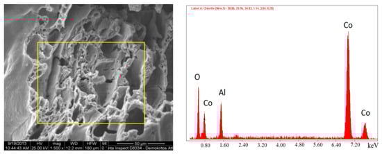 SEM images of the 60% Cο(ΝΟ3)2 + 40% Al(NO3)3 catalyst (synthesis temperature T = 500 °C) after 8 h of operation, and EDS at the point marked in the image.
