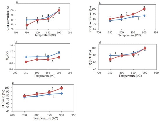 Conversion of CH4 (a) and CO2 (b), H2/CO ratio (c), Η2 yield (d) and CO (e) for SCS co-catalysts depending on the reaction temperature of the carbon dioxide conversion of methane; 1: 60% Cο(ΝΟ3)2 + 40% Al(NO3)3 + 60% urea; 2: 30% Cο(ΝΟ3)2 + 70% Al(NO3)3 + 60% urea. GHSV = 860 h−1.
