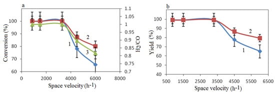 Effect of space velocity on conversion of CH4, CO2 and Η2/CO ratio at 900 °C (a) in reaction products, and Η2 and CO yields (b). (a) 1—CH4 conversion, 2—CO2 conversion, 3—H2/CO ratio; (b) 1—H2 yield, 2—CO yield.