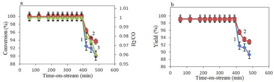 Dependence of the conversion of CH4, CO2, Η2/CO ratio and yields of products vs. time-on-stream. (a) 1—CH4 conversion, 2—CO2 conversion, 3—H2/CO ratio; (b) 1—H2 yield, 2—CO yield; GHSV = 3300 h−1.